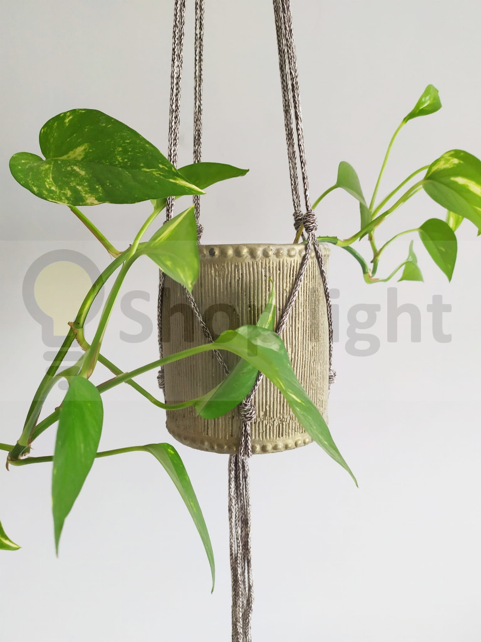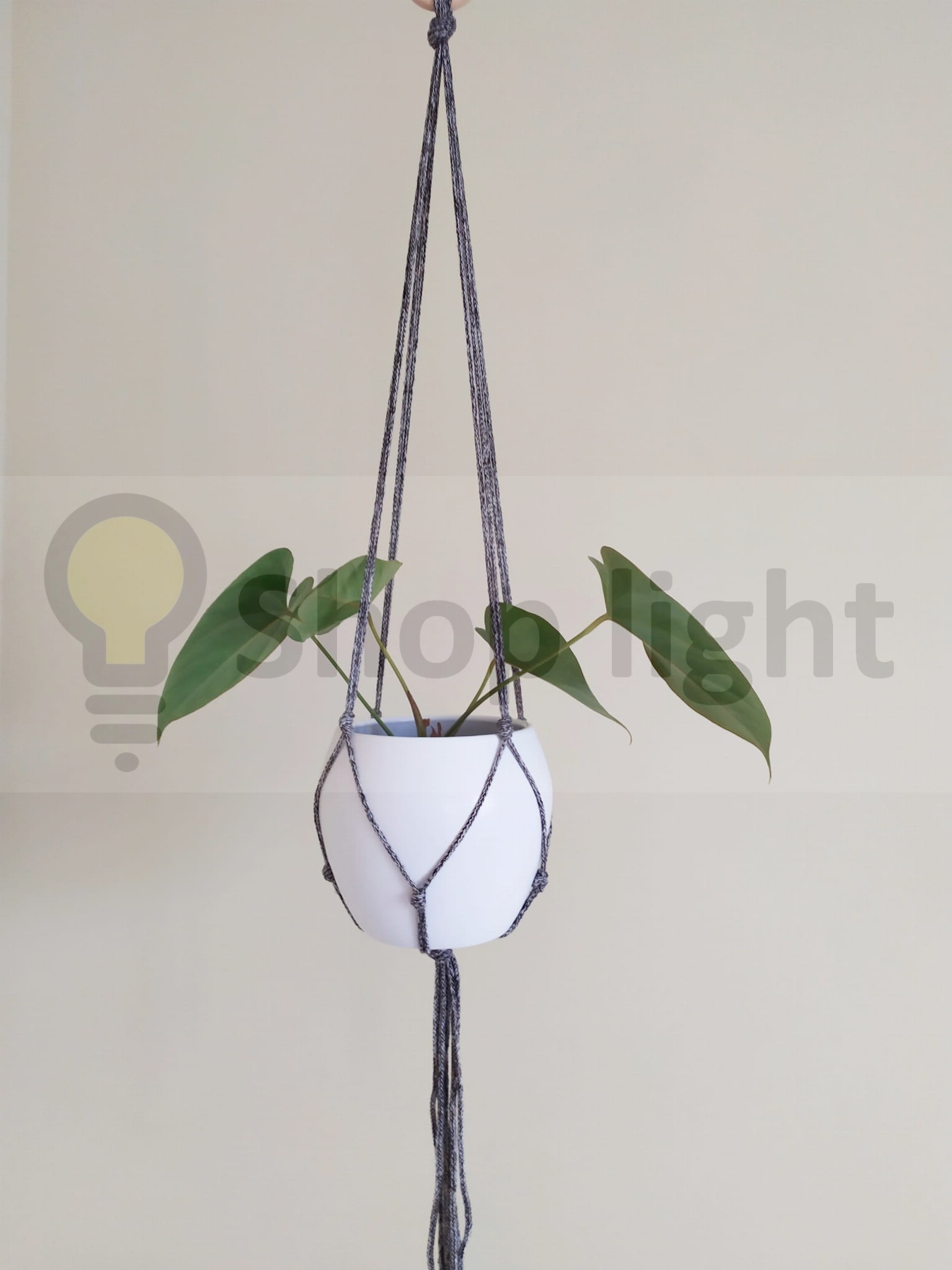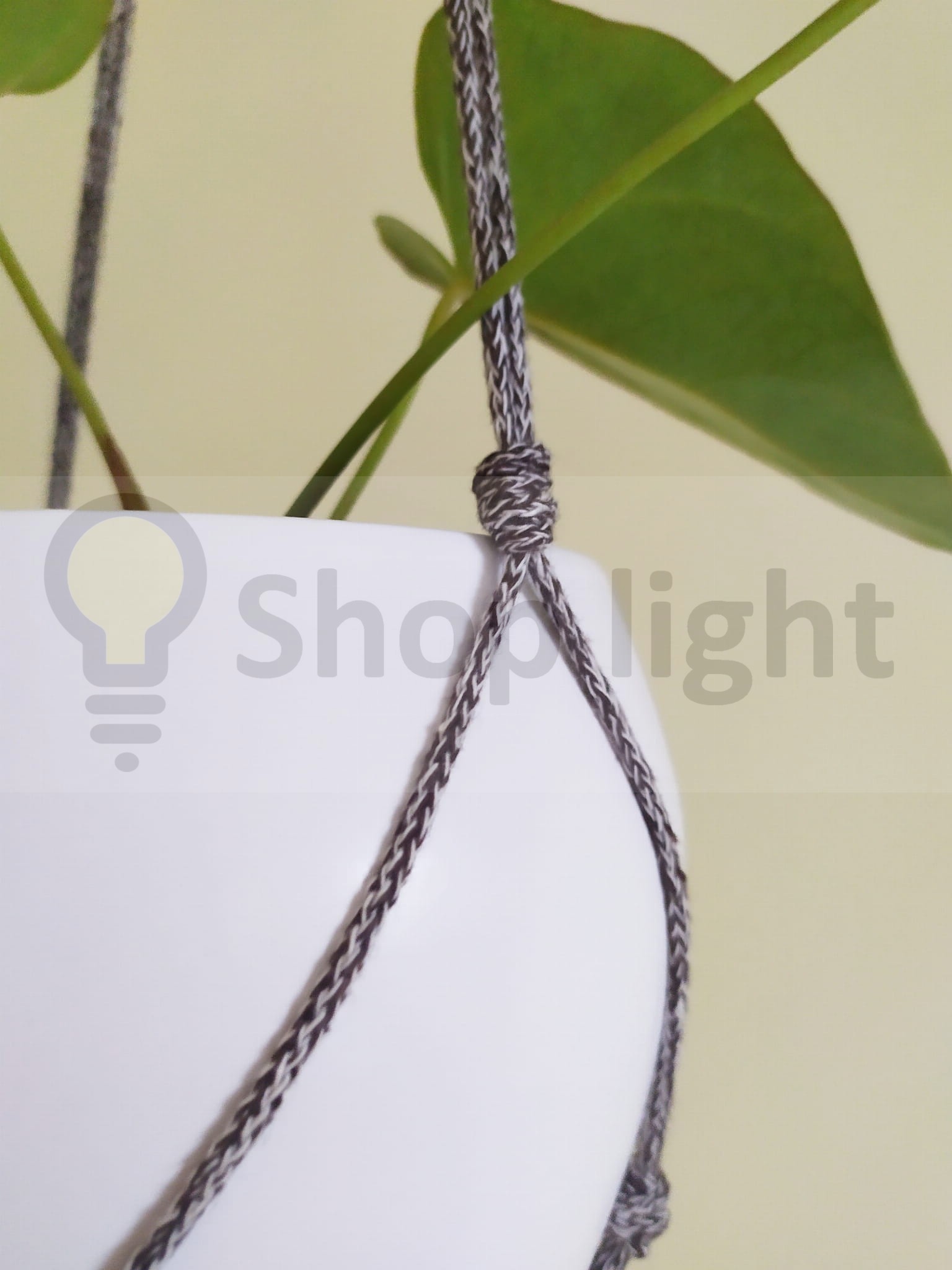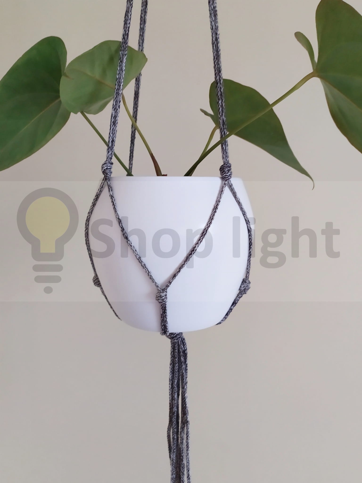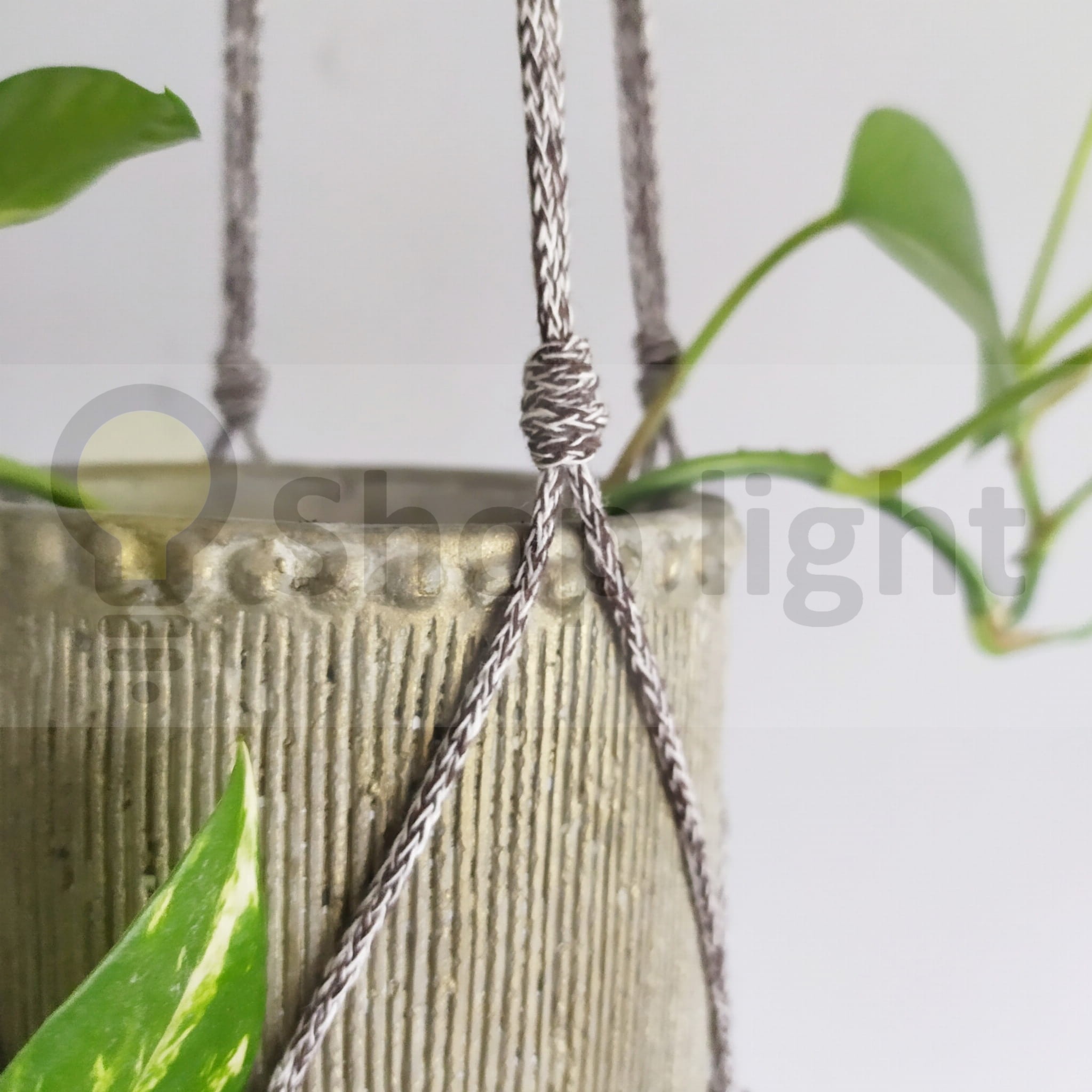Kwietnik makrama wiszący w kolorze brązowy melanż. Wygląda pięknie z zielenią roślin.