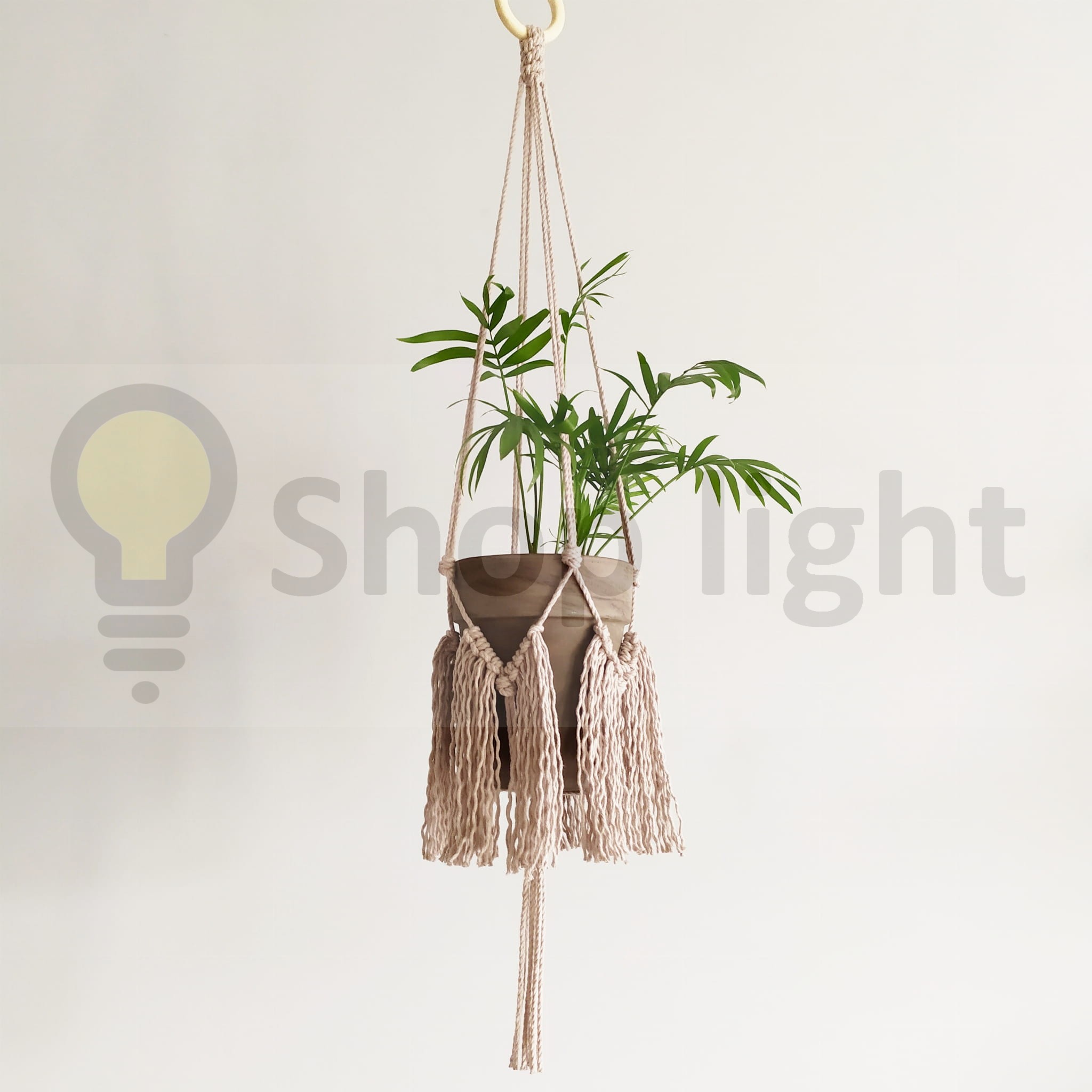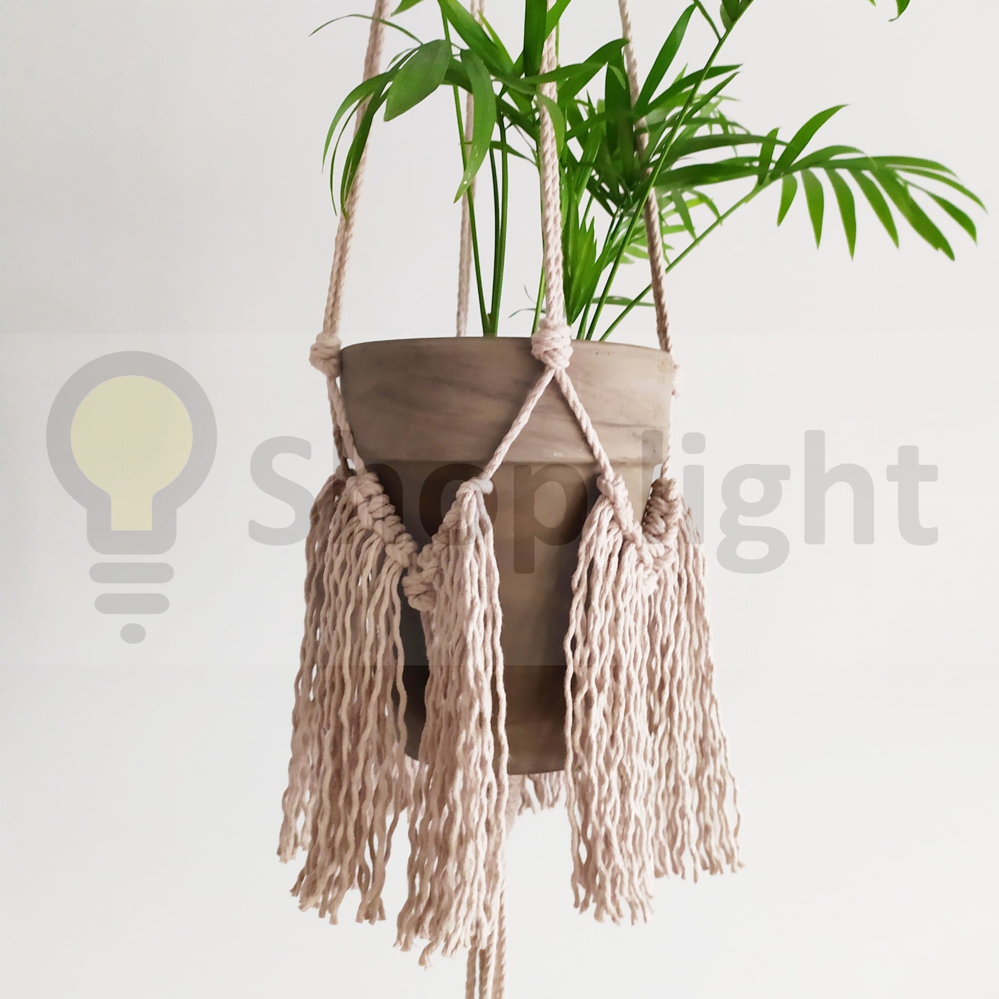 Kwietnik makrama wiszący w kolorze perłowym. Elegancko prezentuje się z zielenią kwiatów.