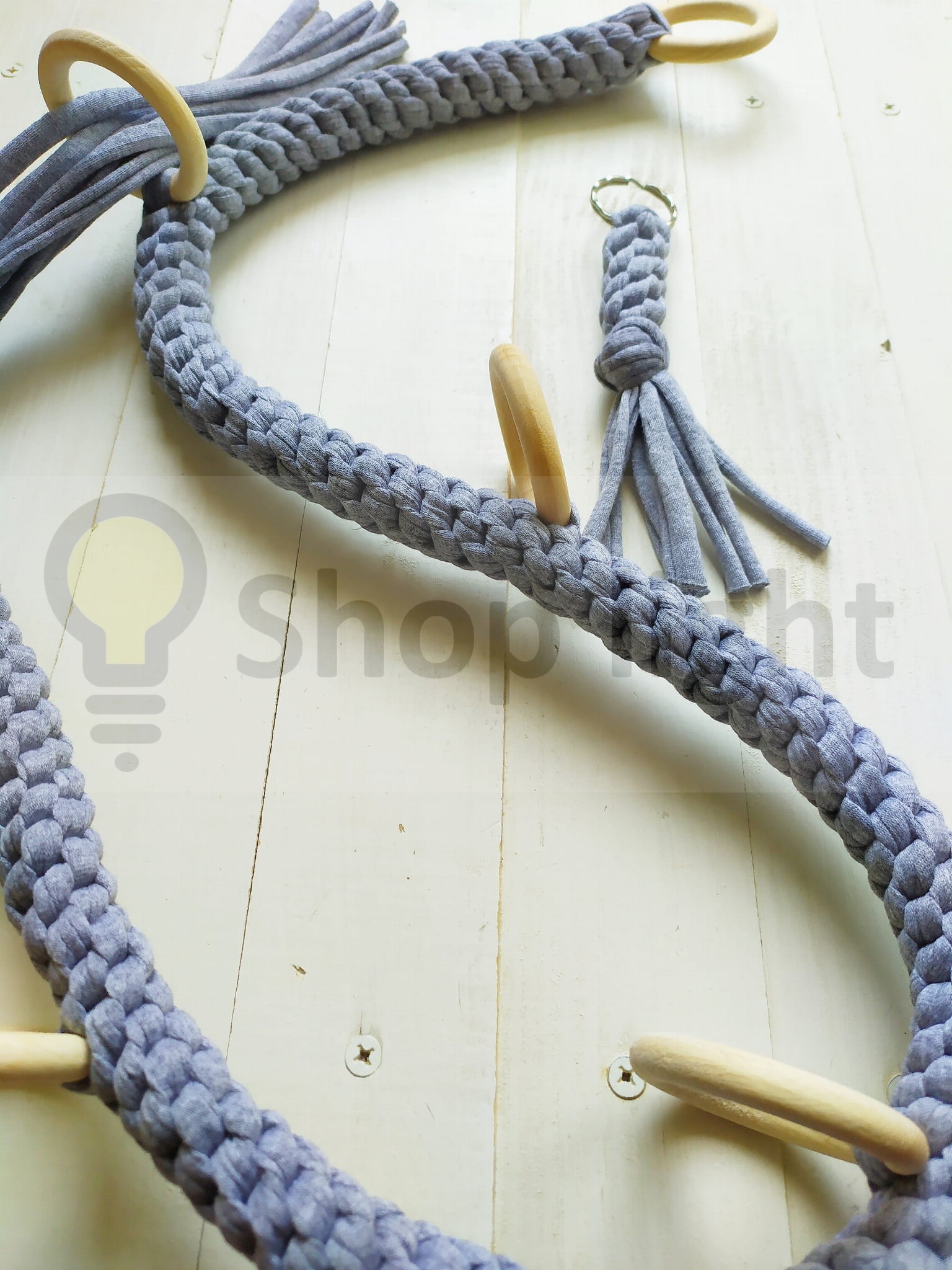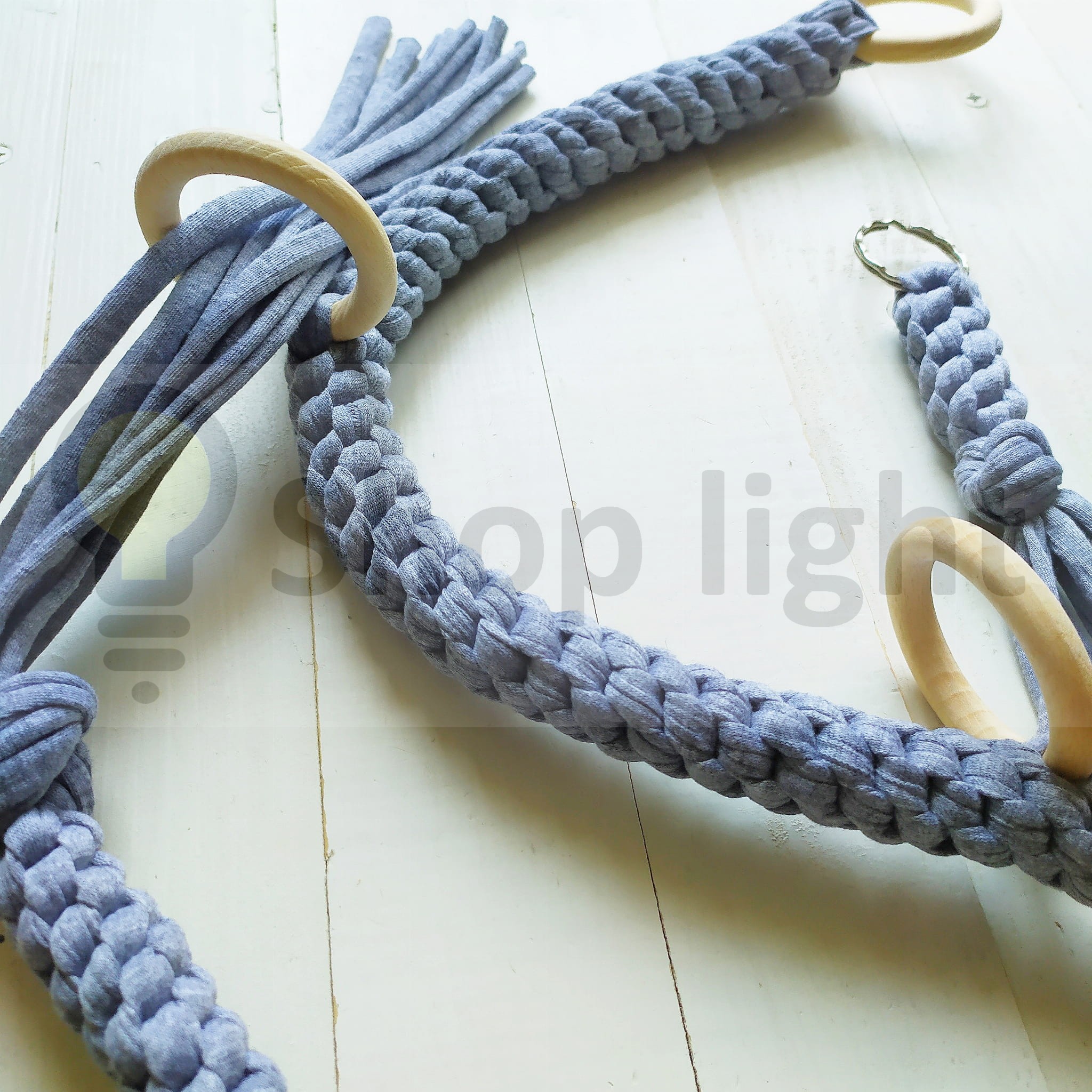 Kwietnik z oferty to kwietnik wiszący- szary. Wykonany jest ze sznurka bawełnianego.