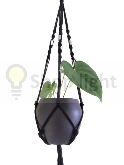 Kwietnik makrama wiszący w kolorze czarnym. Elegancko prezentuje się z zielenią kwiatów. Kwietnik elegancki, gustowny.